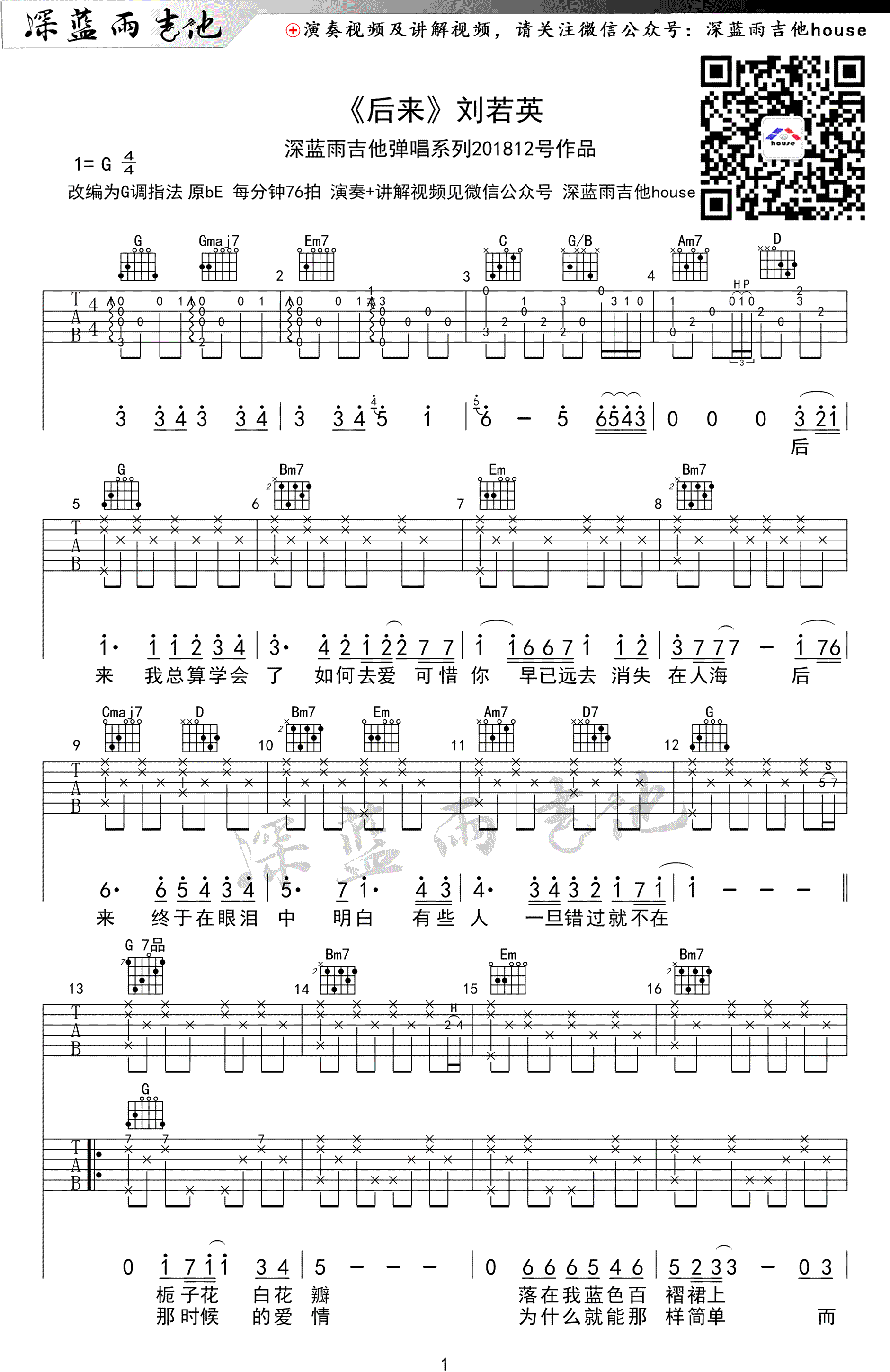 后来吉他谱,取自演唱的歌曲是经典G调指弹编配的曲谱,非常好听的弹唱曲谱,下面4张高清曲谱由吉曲谱网为大家更新分享,有喜欢吉它的朋友欢迎关注!