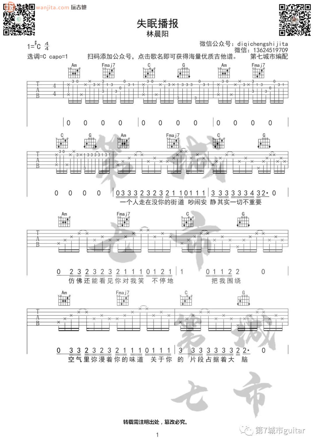 失眠播报吉他谱,取自演唱的歌曲是经典C调指弹编配的曲谱,非常好听的弹唱曲谱,下面2张高清曲谱由吉曲谱网为大家更新分享,有喜欢吉它的朋友欢迎关注!