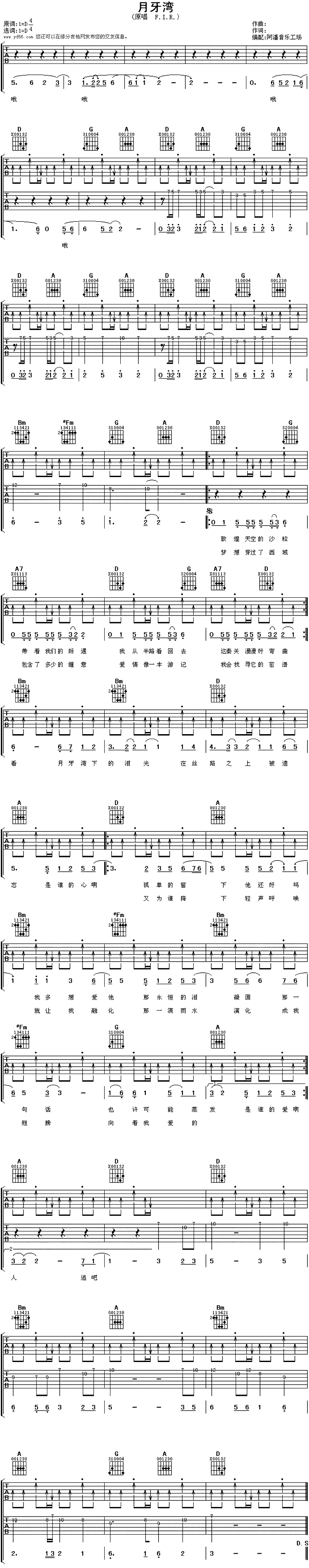 月牙湾吉他谱,原版歌曲,简单D调弹唱教学,六线谱指弹简谱4张图