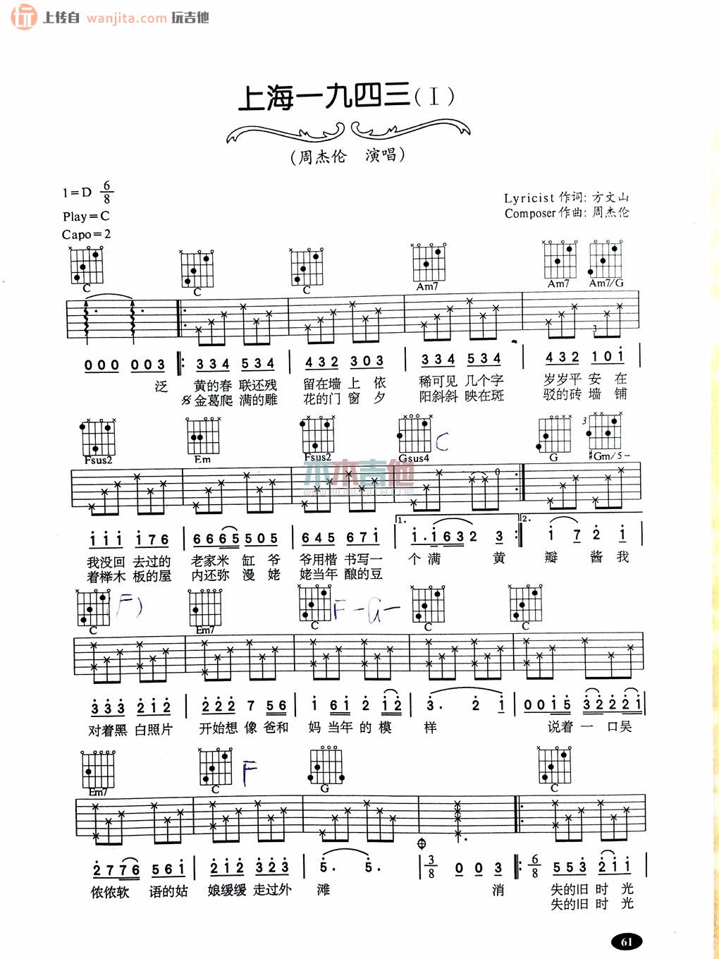 上海一九四三吉他谱,取自演唱的歌曲是经典C调指弹编配的曲谱,非常好听的弹唱曲谱,下面2张高清曲谱由吉曲谱网为大家更新分享,有喜欢吉它的朋友欢迎关注!