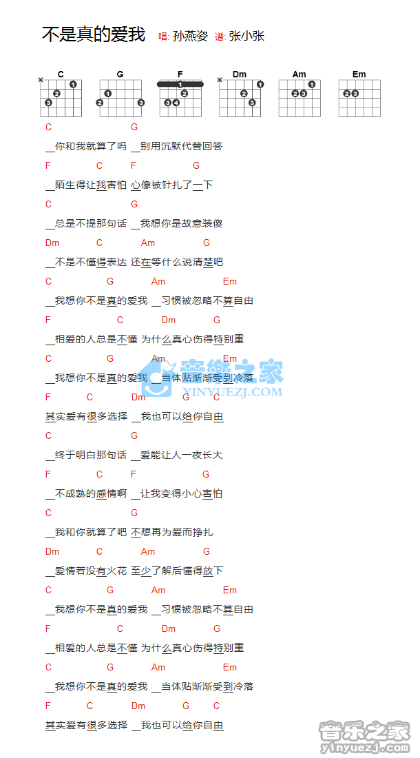 不是真的爱我吉他谱,原版歌曲,简单C调弹唱教学,六线谱指弹简谱1张图