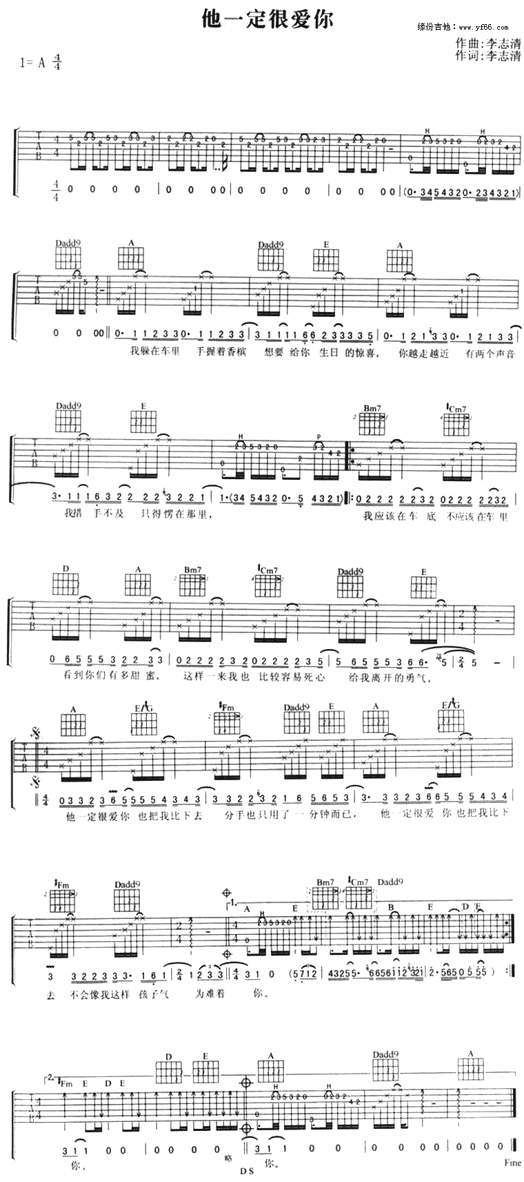 周华健《其实不想走》,刘志宏歌曲,简单指弹教学简谱,无限延音六线谱图片