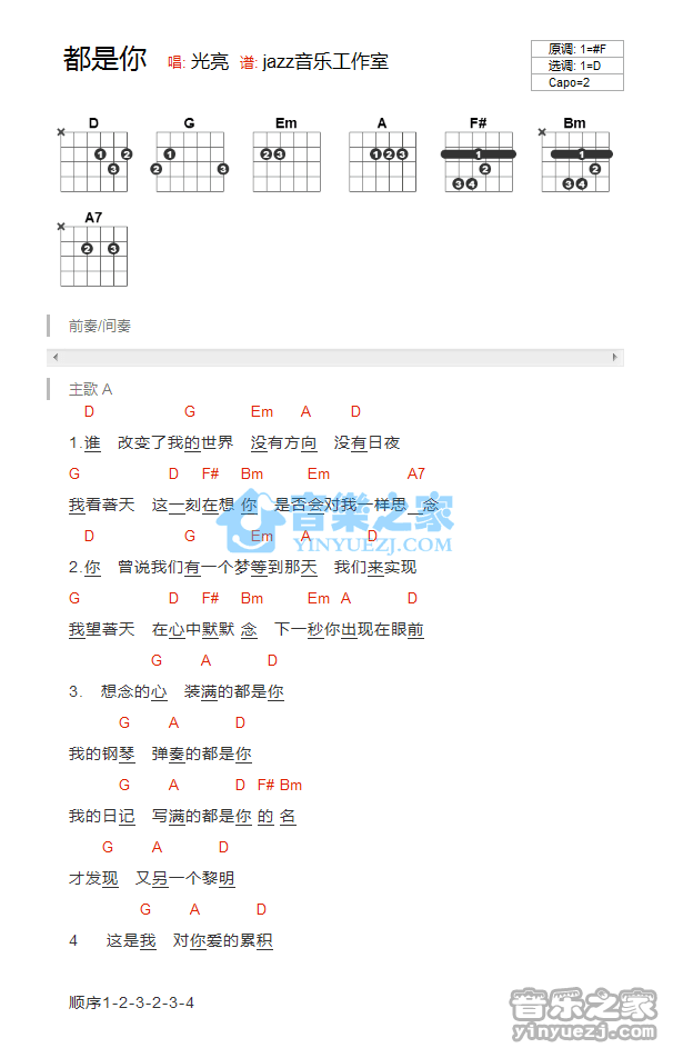 都是你吉他谱,取自演唱的歌曲是经典D调指弹编配的曲谱,非常好听的弹唱曲谱,下面1张高清曲谱由吉曲谱网为大家更新分享,有喜欢吉它的朋友欢迎关注!