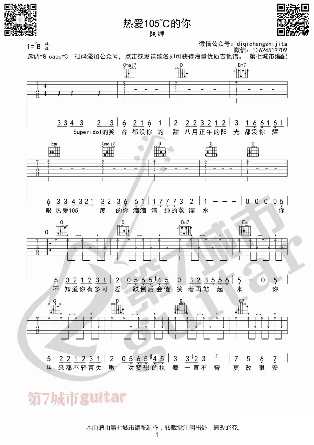 洒水车吉他谱,柳爽演唱的歌曲,是一首G调编配的指弹吉他简谱,弹唱时可夹第2品(Capo=2),《洒水车》原调为A本谱采用G调,是非常好听的弹唱曲谱,下面7张高清曲谱由极网吉它谱为大家更新分享,有喜欢吉它的朋友欢迎关注......