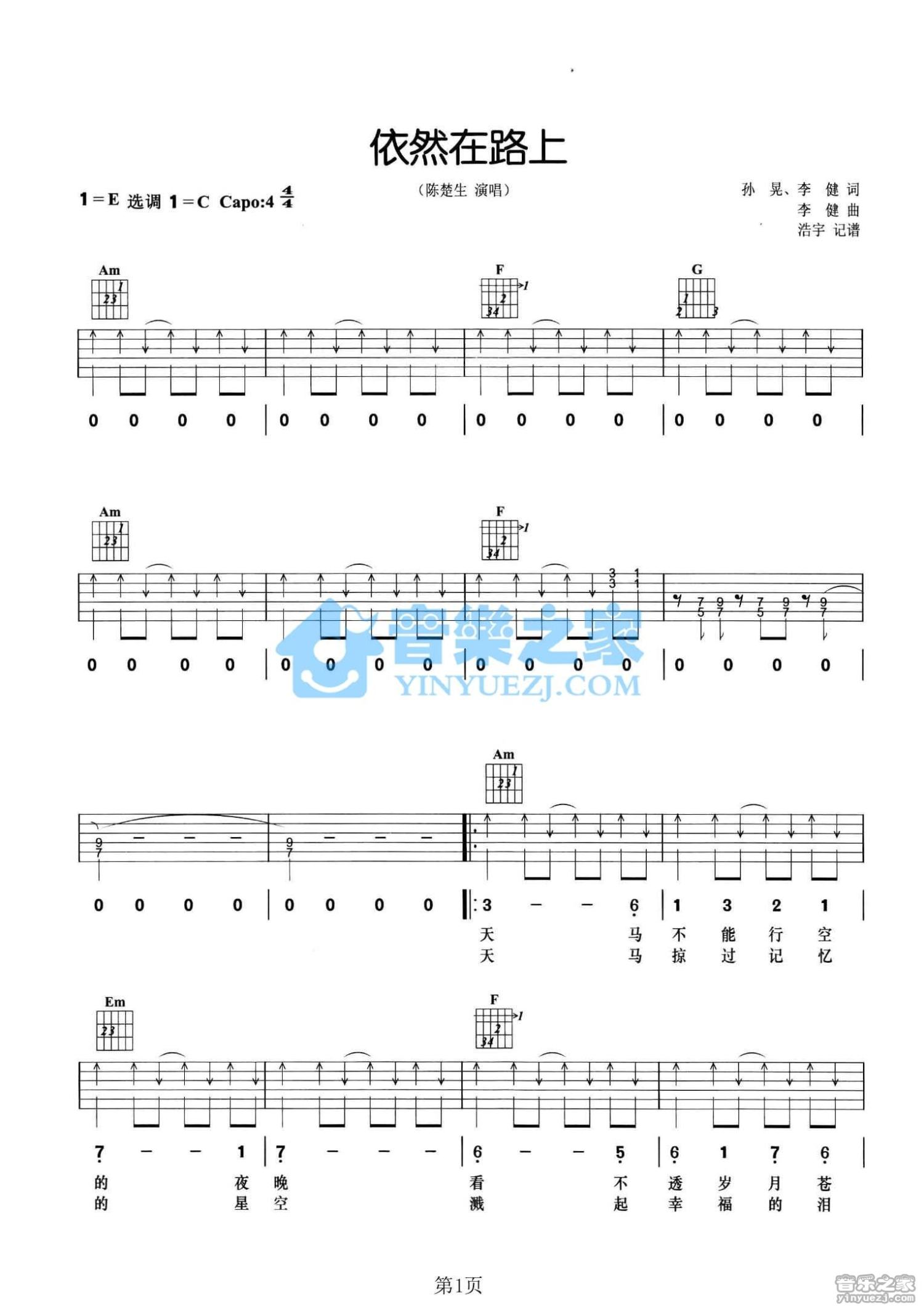 依然在路上吉他谱,取自演唱的歌曲是经典C调指弹编配的曲谱,非常好听的弹唱曲谱,下面2张高清曲谱由吉曲谱网为大家更新分享,有喜欢吉它的朋友欢迎关注!