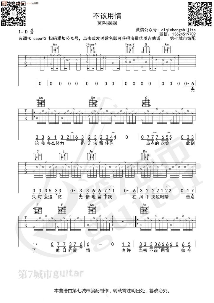 网红神曲_不该用情吉他谱,它是莫叫姐姐演唱的原版歌曲,经典歌曲编配的指弹简单版吉他谱子,六线简谱是吉他坊整理制作,是非常好听的入门弹唱曲谱,
