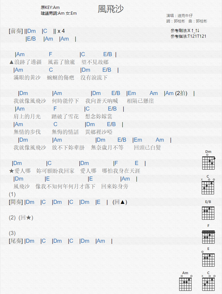 风飞沙吉他谱,简单C调原版指弹曲谱,迪克牛仔高清流行弹唱六线乐谱