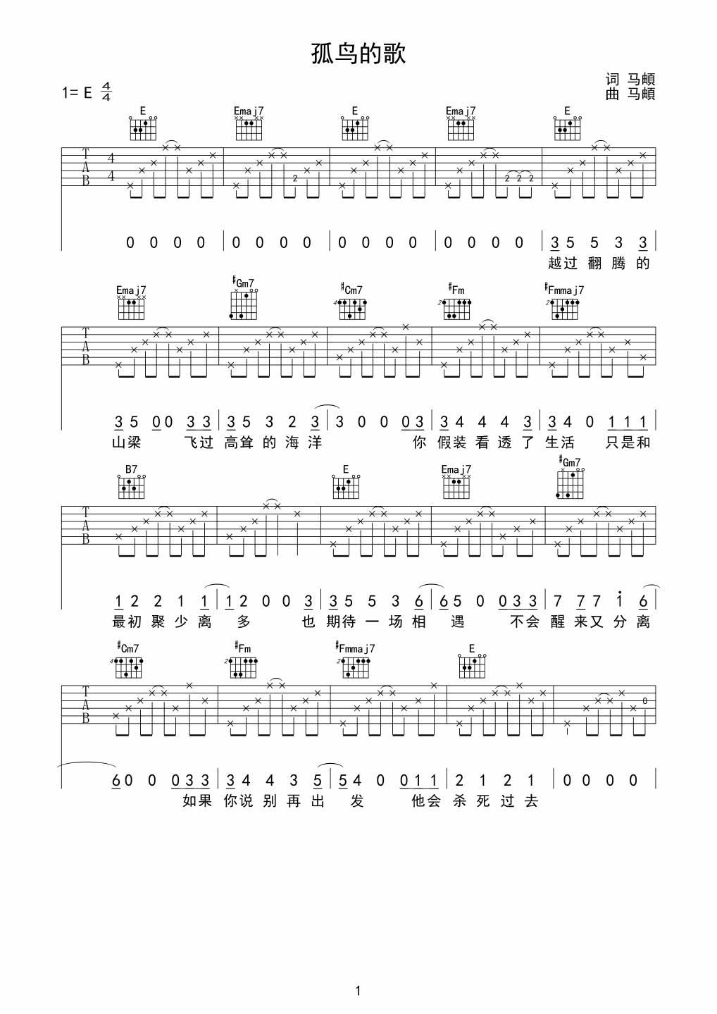孤鸟的歌吉他谱,取自演唱的歌曲是经典E调指弹编配的曲谱,非常好听的弹唱曲谱,下面3张高清曲谱由吉曲谱网为大家更新分享,有喜欢吉它的朋友欢迎关注!