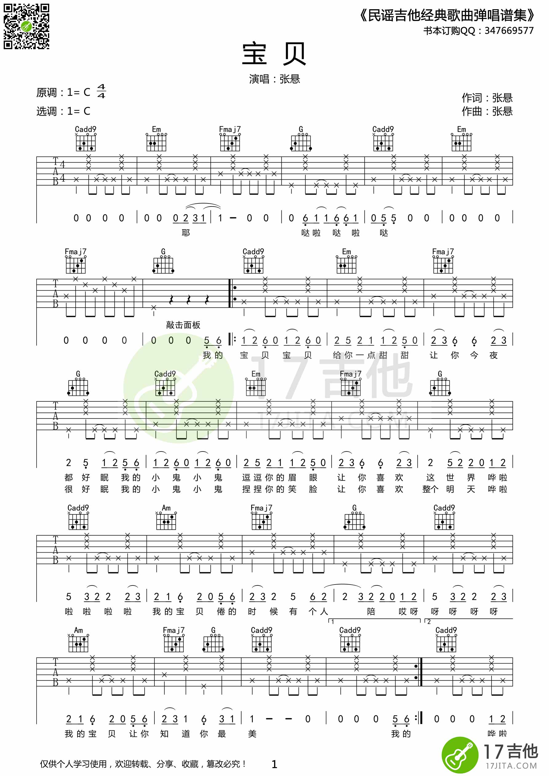 宝贝吉他谱,原版歌曲,简单C调弹唱教学,六线谱指弹简谱1张图