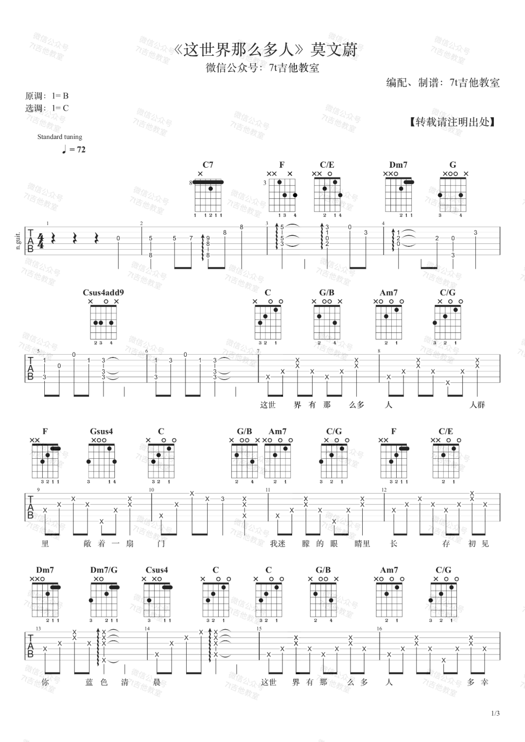 这世界那么多人吉他谱,取自演唱的歌曲是经典B调指弹编配的曲谱,非常好听的弹唱曲谱,下面3张高清曲谱由吉曲谱网为大家更新分享,有喜欢吉它的朋友欢迎关注!