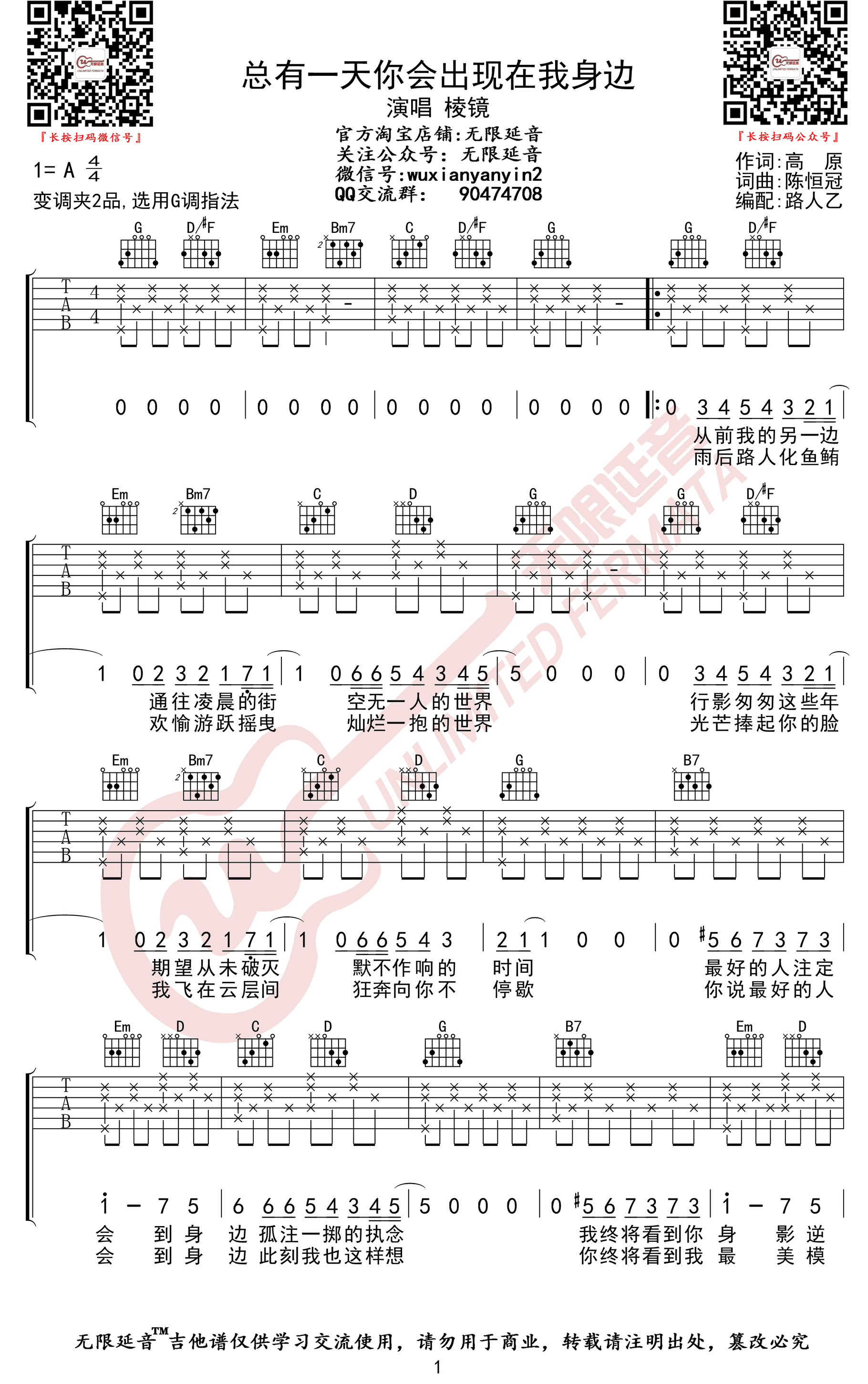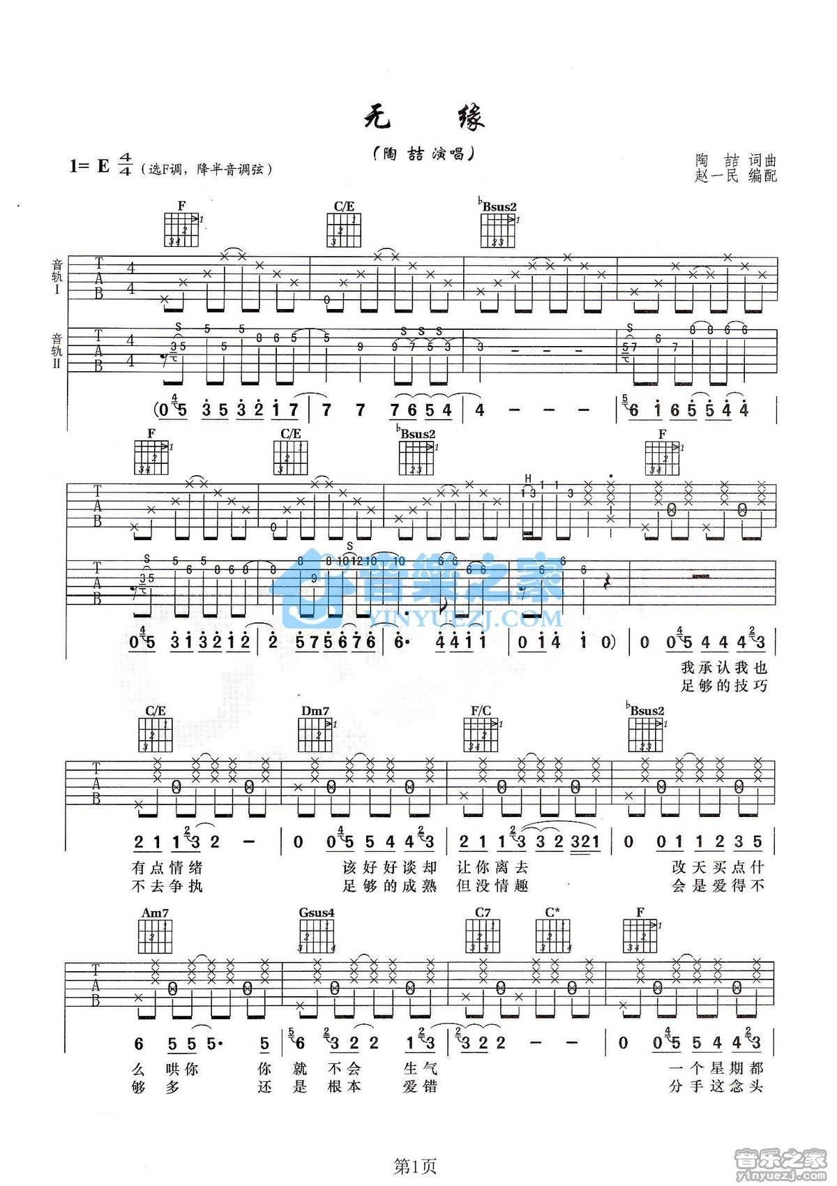 无缘吉他谱,取自演唱的歌曲是经典E调指弹编配的曲谱,非常好听的弹唱曲谱,下面2张高清曲谱由吉曲谱网为大家更新分享,有喜欢吉它的朋友欢迎关注!
