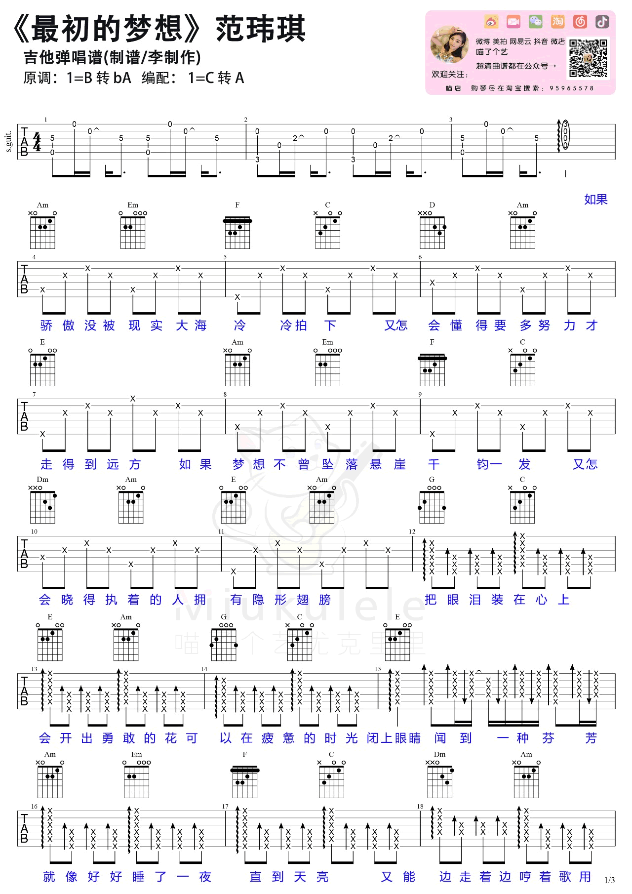 范玮琪最初的梦想吉他谱,它是由范玮琪演唱的歌曲,由喵了个艺制谱,经典的范玮吉他指弹简谱,非常好听的的弹唱曲谱,下面吉它谱网为大家分享高清六线谱图片和歌词,有喜欢吉它的朋友欢迎关注
