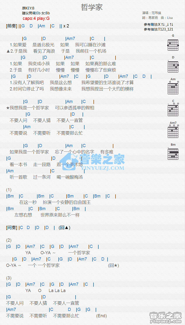 哲学家吉他谱,取自演唱的歌曲是经典G调指弹编配的曲谱,非常好听的弹唱曲谱,下面1张高清曲谱由吉曲谱网为大家更新分享,有喜欢吉它的朋友欢迎关注!