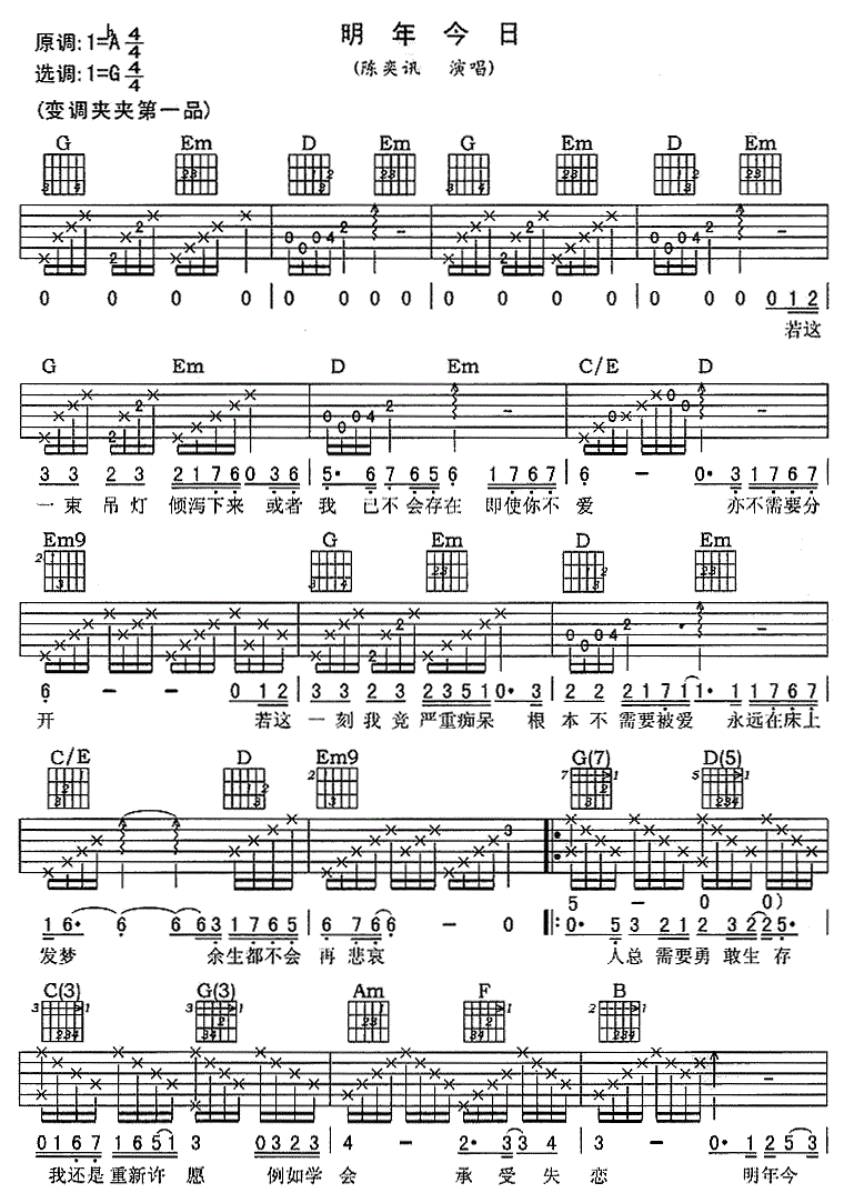 陪你度过漫长岁月吉他谱,简单C调原版指弹曲谱,陈奕迅高清流行弹唱G调弹唱视频六线乐谱