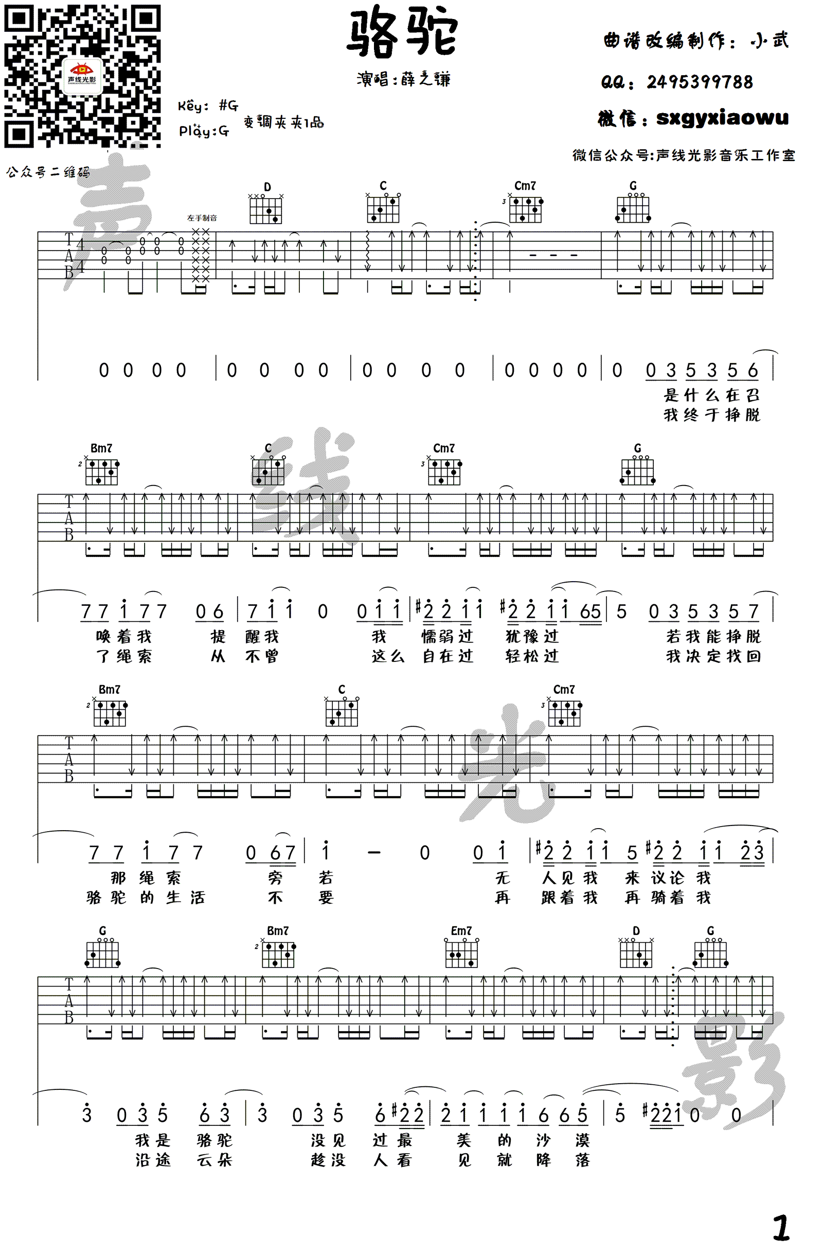薛之谦骆驼吉他谱,它是由薛之谦演唱的歌曲,由声线光影制谱,经典的四张吉他指弹简谱,非常好听的的弹唱曲谱,下面吉它谱网为大家分享高清六线谱图片和歌词,有喜欢吉它的朋友欢迎关注