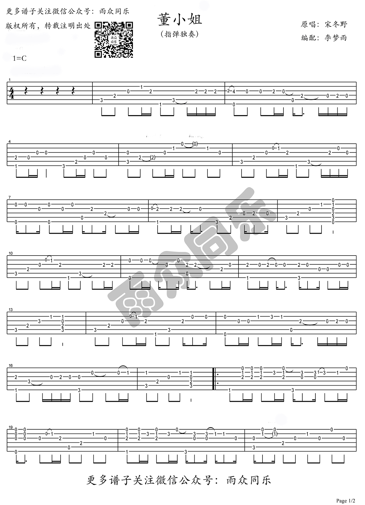 宋冬野董小姐吉他谱,它是宋冬野演唱的原版歌曲,这首歌的表现力非常自然和流畅.经典歌曲编配的高清指弹简单版吉他谱子,六线简谱是雨众同乐制作,是非常好听的入门弹唱曲谱,下面为大家分享高清图片谱,有喜欢吉它的朋友欢迎关注!
