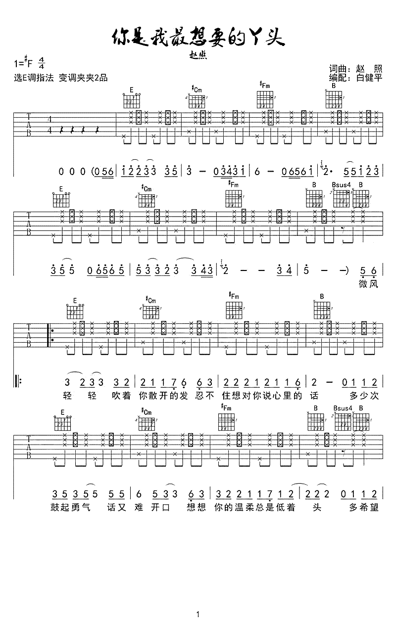 你就是我最想要的丫头吉他谱,赵照创作演唱的民谣歌曲,你就是我最想要的丫头六线谱,四张高清图片谱,原调#F,选用E调指法,变调夹夹2品,白健平的编配和分享,吉他部落 jita2012.com整理上传。 开头那声口哨真是太惊艳,又显俏皮,抱着一把吉他,坐在那里就这样一字一句的唱着你就是我快乐的源头,为你祈祷,为你逗留,你就是我最想要的丫头。说心里话,