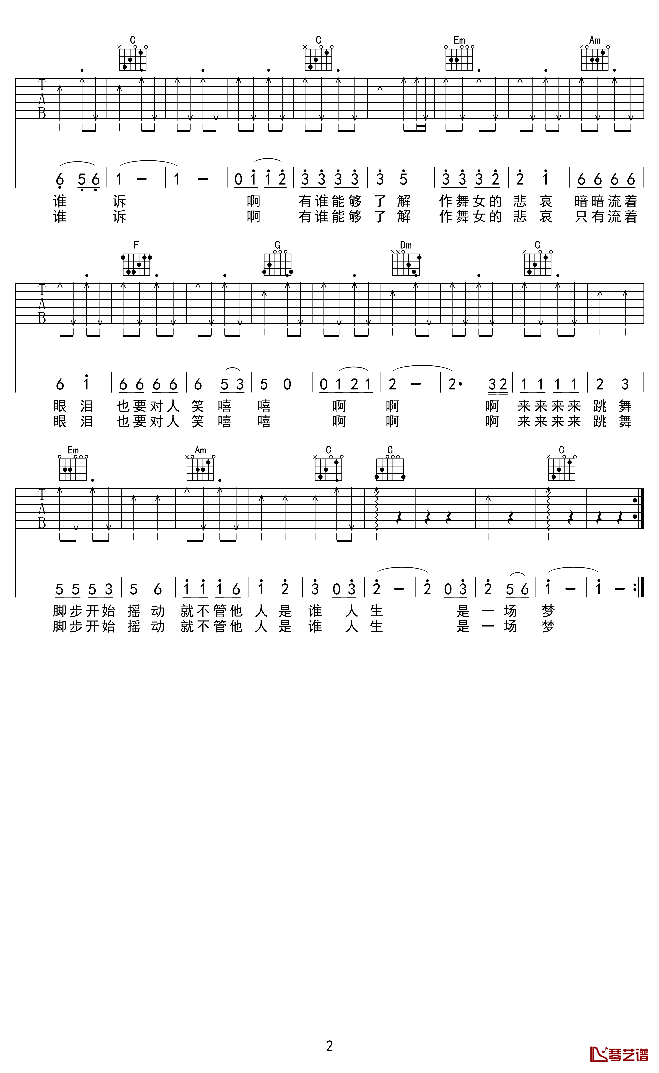 舞女吉他谱,它是韩宝仪演唱的歌曲,由打谱啦编配制谱,是一首经典歌曲编配的C调指弹编配的曲谱,