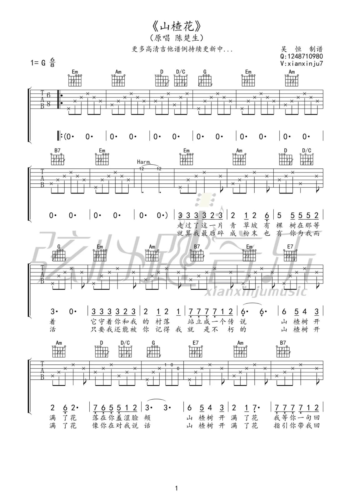 山楂树吉他谱,它是陈楚生演唱的歌曲,由弦心跳音乐编配制谱,是一首经典歌曲编配的G调指弹编配的曲谱,