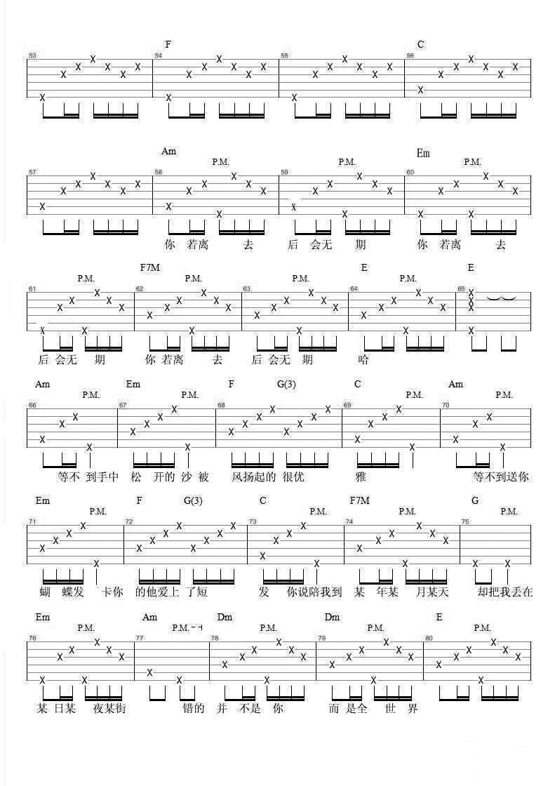 后会无期吉他谱,汪苏泷和徐良合唱,后会无期六线谱,选调C夹2品,感谢李雪老师的提供和分享,吉他部落 jita2012.com整理上传。弹奏说明:Pm处的弹法为右手大拇指拍打在六弦产生类似于军鼓击边的效果。P处为右手大拇指敲打琴桥上一指的位置4、5、6弦制造成底鼓加贝斯的感觉。GTP5上不怎么表达这两处所以选了两个字母做为特殊弹法标注。祝典:评论一般