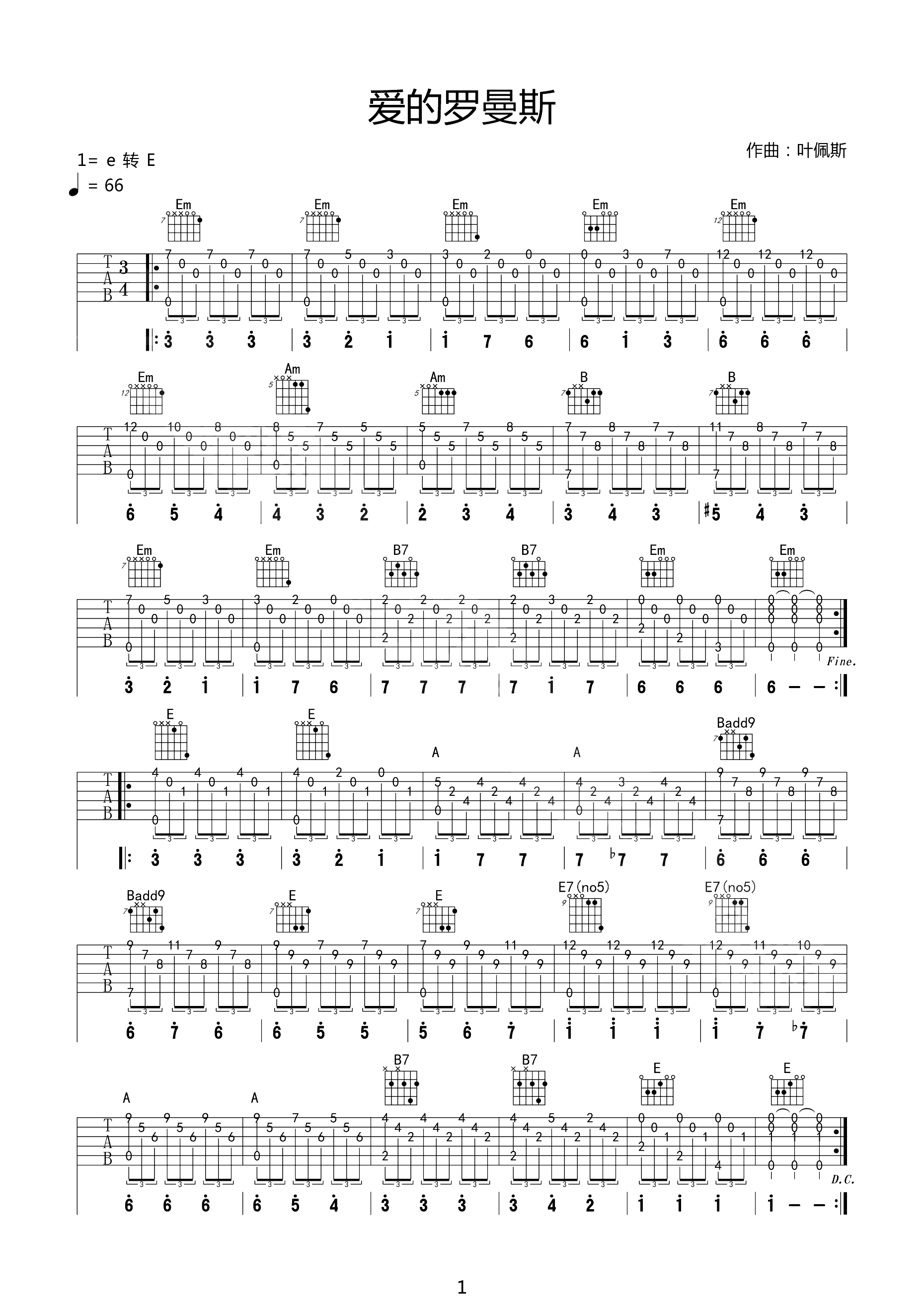 林俊杰她说吉他谱,简单男声原版指弹曲谱,林俊杰高清六线乐谱
