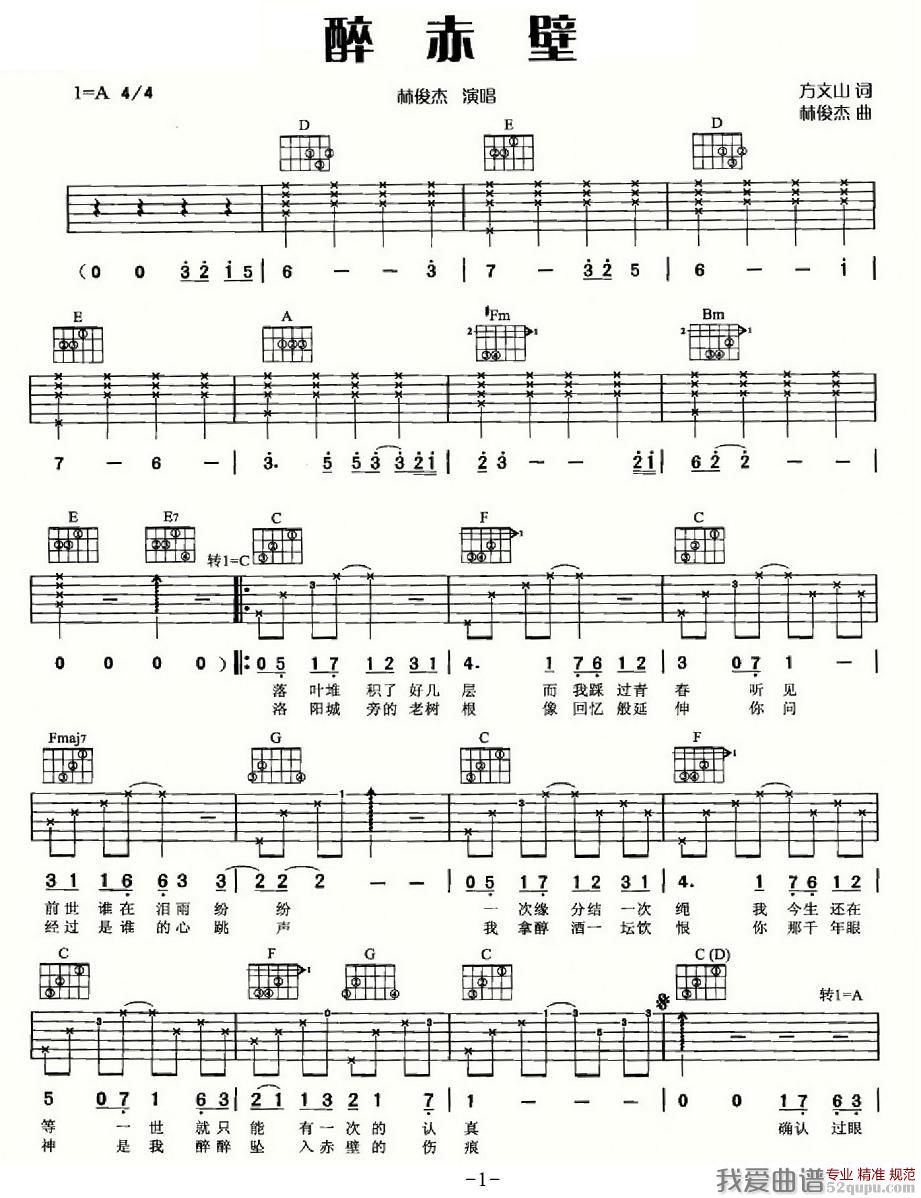 醉赤壁吉他谱,简单醉赤原版指弹曲谱,林俊杰高清流行弹唱/六线谱六线乐谱
