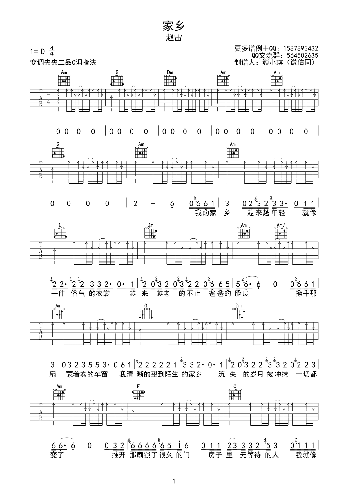 家乡吉他谱,赵雷《家乡》弹唱六线谱,三张高清图片谱。赵雷词曲演唱的一首民谣歌曲。原调D,选用C调指法,变调夹2品。感谢巍小琪的制谱,吉他部落 jita2012.com为琴友们整理上传。家是港湾,乡是故土。赵雷这曲歌曲真挚动情,质朴温暖,唱出离乡的愁绪和思念,给在外漂泊的游子以温情慰藉以及治愈的力量。醉死此生:这绝对是网易云翻唱民谣最