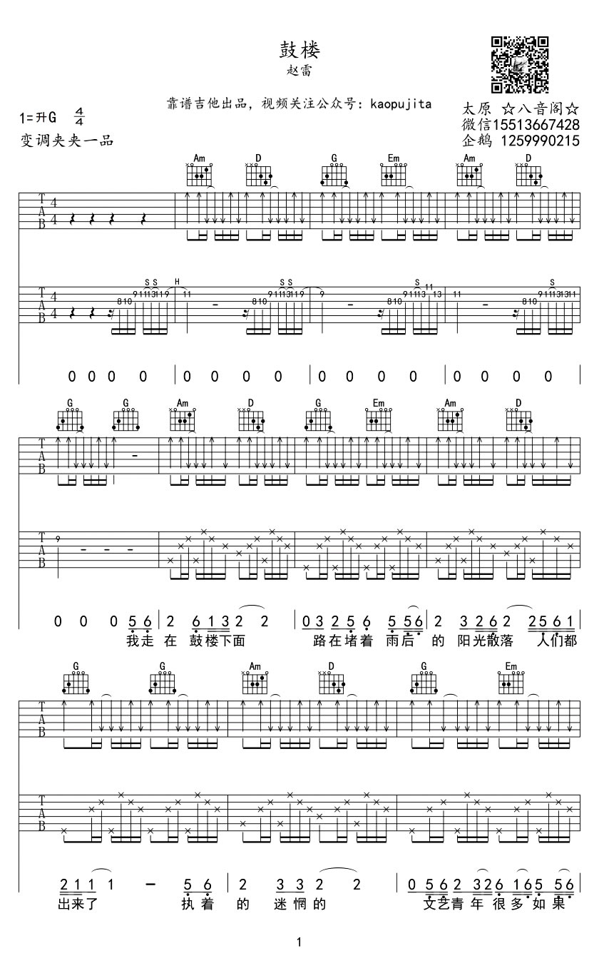 赵雷鼓楼吉他谱,升G调变调夹夹一品,鼓楼六线谱,三张图片谱,赵雷我们的时光全国巡回演唱会中演唱的一首民谣作品,一首充满着故事的歌曲《鼓楼》吉他弹唱谱。赵雷用他的眼睛看着热闹的鼓楼,也看着自己一颗不那么热血但是也能解决温饱的梦。 大梦一场的小马先森:2014年开着自己2万块钱淘来的破车在大街上闲逛,看见一妹子好