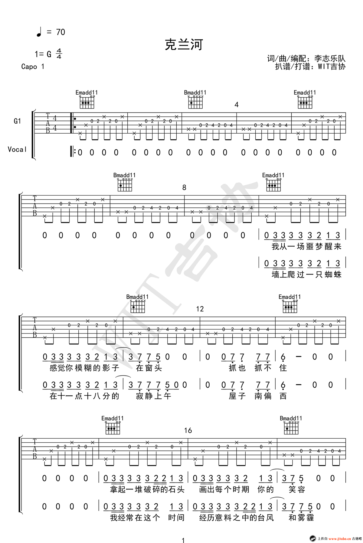 https://www.99jita.com/pu/3155.html版权声明: 本文内容【李志克兰河吉他谱-G调弹唱谱高清图片谱】来自「WIT吉协」,吉他谱网收录仅供吉他爱好者交流学习,网站内容均来源于互联网 如有侵权联系删除
