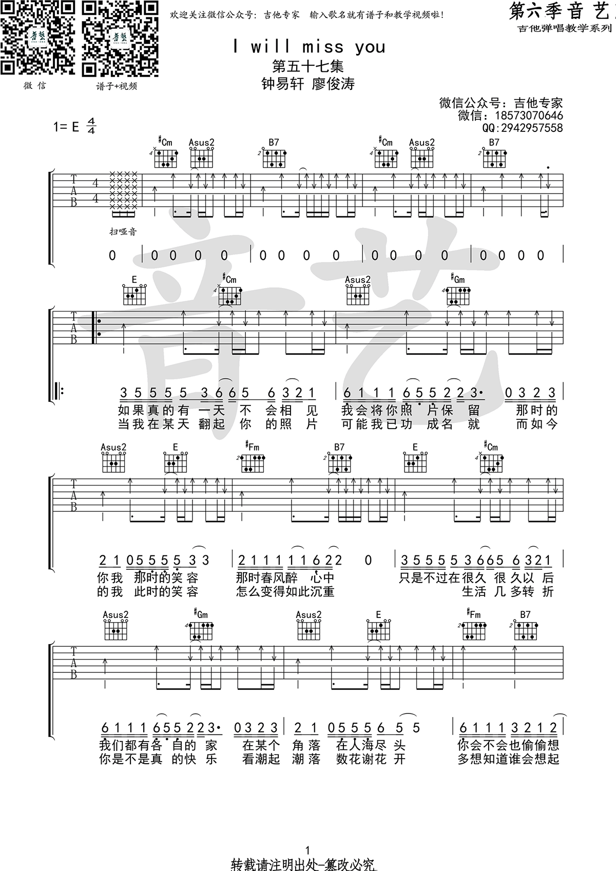 钟易轩VS廖俊涛Iwillmis吉他谱,它是由钟易轩演唱的歌曲,由音艺制谱,经典的99吉他指弹简谱,非常好听的的弹唱曲谱,下面吉它谱网为大家分享高清六线谱图片和歌词,有喜欢吉它的朋友欢迎关注