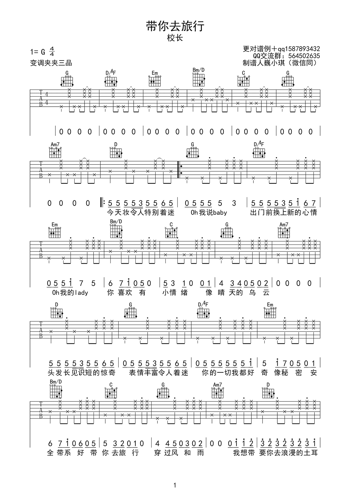 带你去旅行吉他谱,取自演唱的歌曲是经典G调指弹编配的曲谱,非常好听的弹唱曲谱,下面2张高清曲谱由吉曲谱网为大家更新分享,有喜欢吉它的朋友欢迎关注!