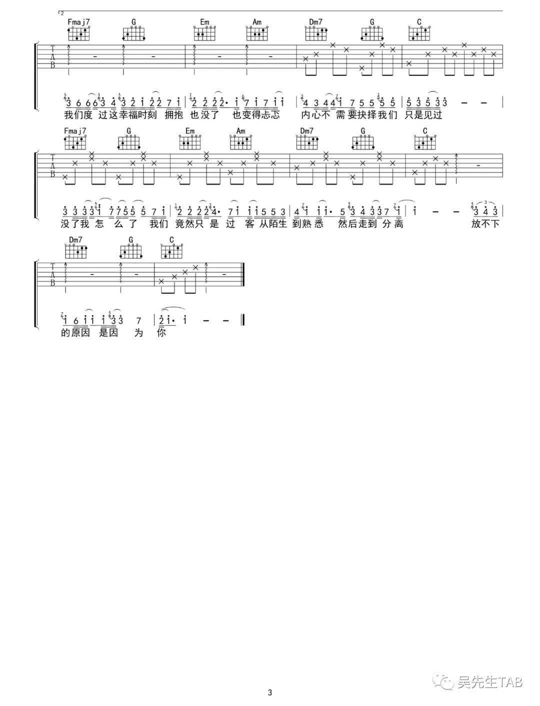 我走后吉他谱本曲谱是选用了C调指法,由吴先生编配完成。每次听完这首歌曲,就好像自己的心被划了一刀,那种撕心裂肺的感觉是没有人能够感同身受的,明明自己很爱很爱一个人,但是却没有办法在一起,这是多么让人心疼和遗憾的事情,特别是在副歌部分才是最动人的,我走后,你别再难过,心里有话都不想再说,记得以后你要快乐,这世界没那么多因果,一字一句地击打着我们的内心,让我们无比心痛。