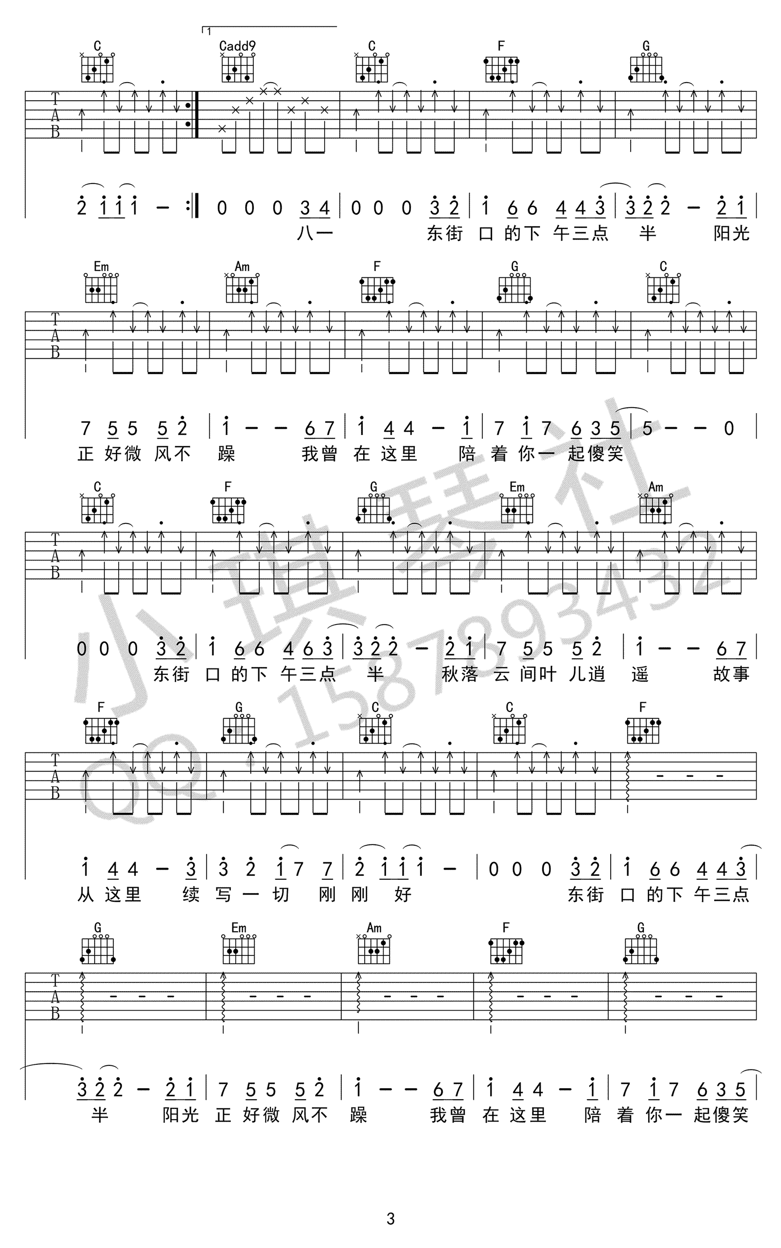 曾宪涛东街口的下午三点半吉他谱,它是由曾宪涛演唱的歌曲,由小琪琴社制谱,经典的高清吉他指弹简谱,非常好听的的弹唱曲谱,下面吉它谱网为大家分享高清六线谱图片和歌词,有喜欢吉它的朋友欢迎关注