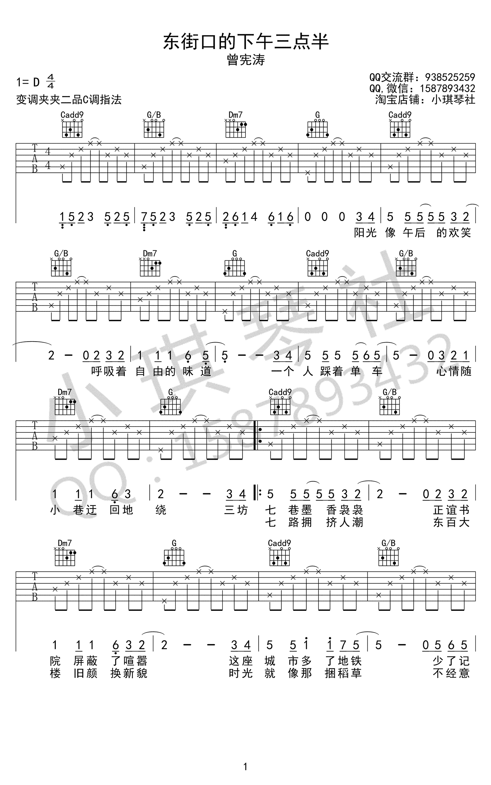 曾宪涛东街口的下午三点半吉他谱,它是曾宪涛演唱的原版歌曲,这首歌的节奏非常流畅和动感.经典歌曲编配的高清指弹简单版吉他谱子,六线简谱是小琪琴社制作,原调D夹二品是非常好听的入门弹唱曲谱,下面为大家分享高清图片谱,有喜欢吉它的朋友欢迎关注!