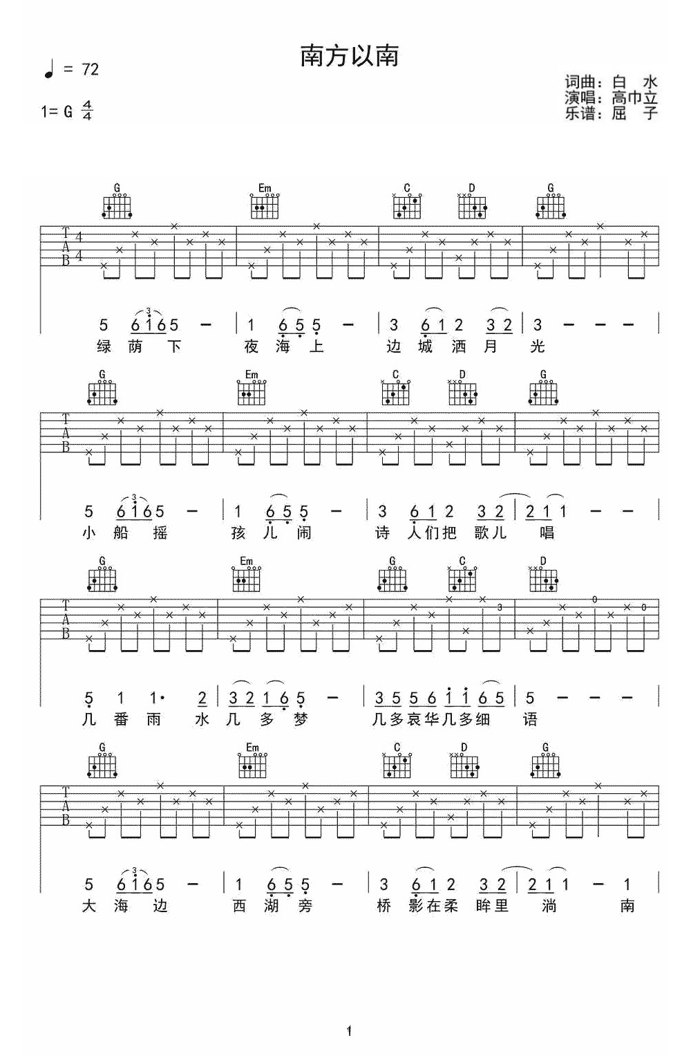 高巾立南方以南吉他谱,它是高巾立演唱的原版歌曲,它的表现力非常强烈和有力.经典歌曲编配的G调指弹简单版吉他谱子,六线简谱是屈子制作,是非常好听的入门弹唱曲谱,下面为大家分享高清图片谱,有喜欢吉它的朋友欢迎关注!