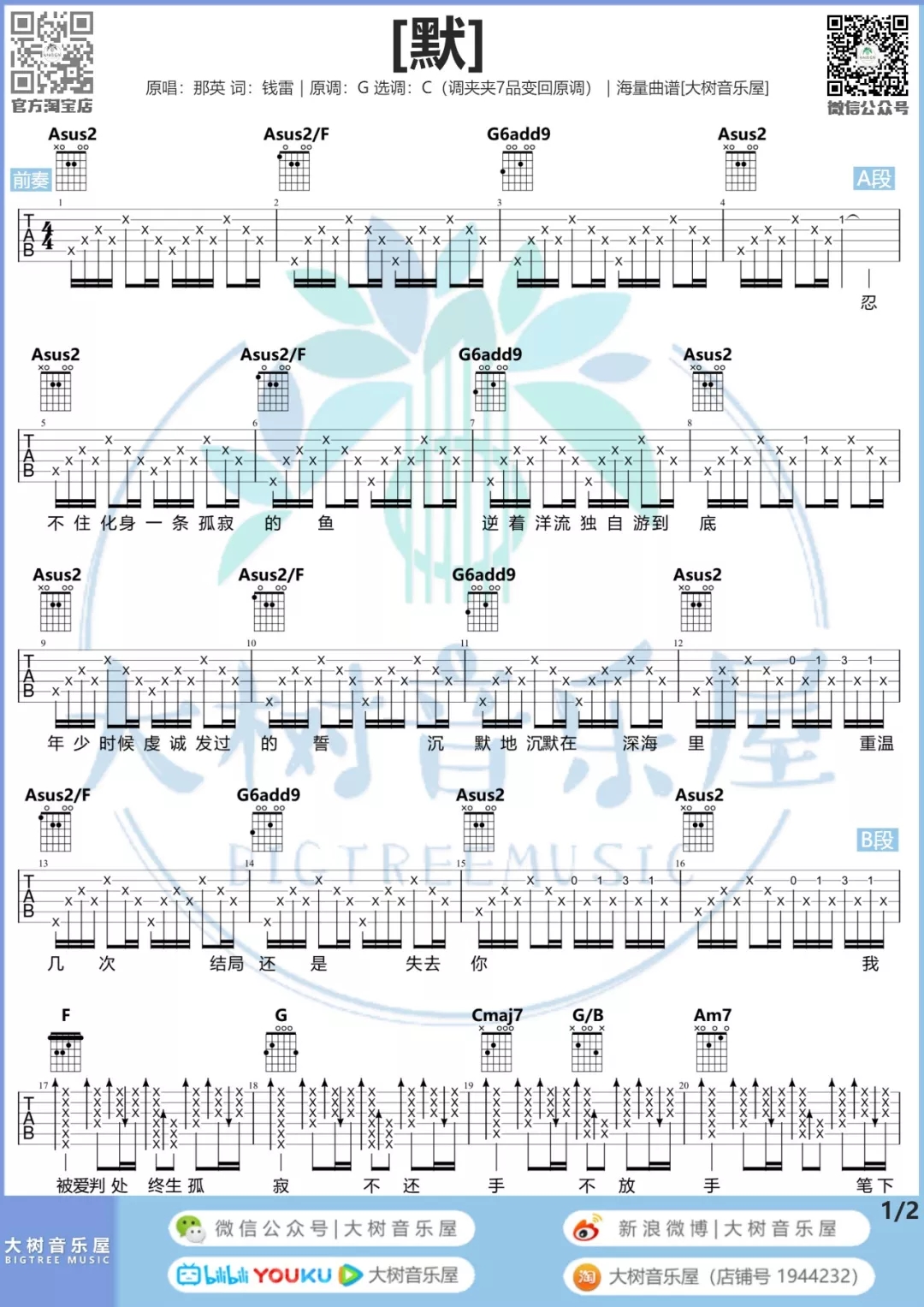 《默》吉他谱,由那英演唱的,流行弹唱,默六线谱,G调制法,一共3张高清弹唱图片谱,采用'4/4拍子,拍速为80-100,单吉他,弹奏难度为:简单,由大树音乐屋编配分享,吉他部落 jita2012.com整理上传。默 吉他简谱默 歌词 作曲 : 钱雷 作词 : 尹约忍不住化身一条固执的鱼逆着洋流独自游到底年少时候虔诚发过的誓沉默地沉没在深海里重温几次结局还是失去你我被爱判处终身孤寂