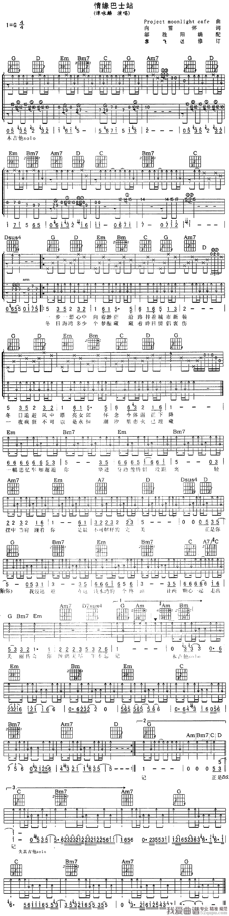 情缘巴士站吉他谱,取自演唱的歌曲是经典G调指弹编配的曲谱,非常好听的弹唱曲谱,下面4张高清曲谱由吉曲谱网为大家更新分享,有喜欢吉它的朋友欢迎关注!