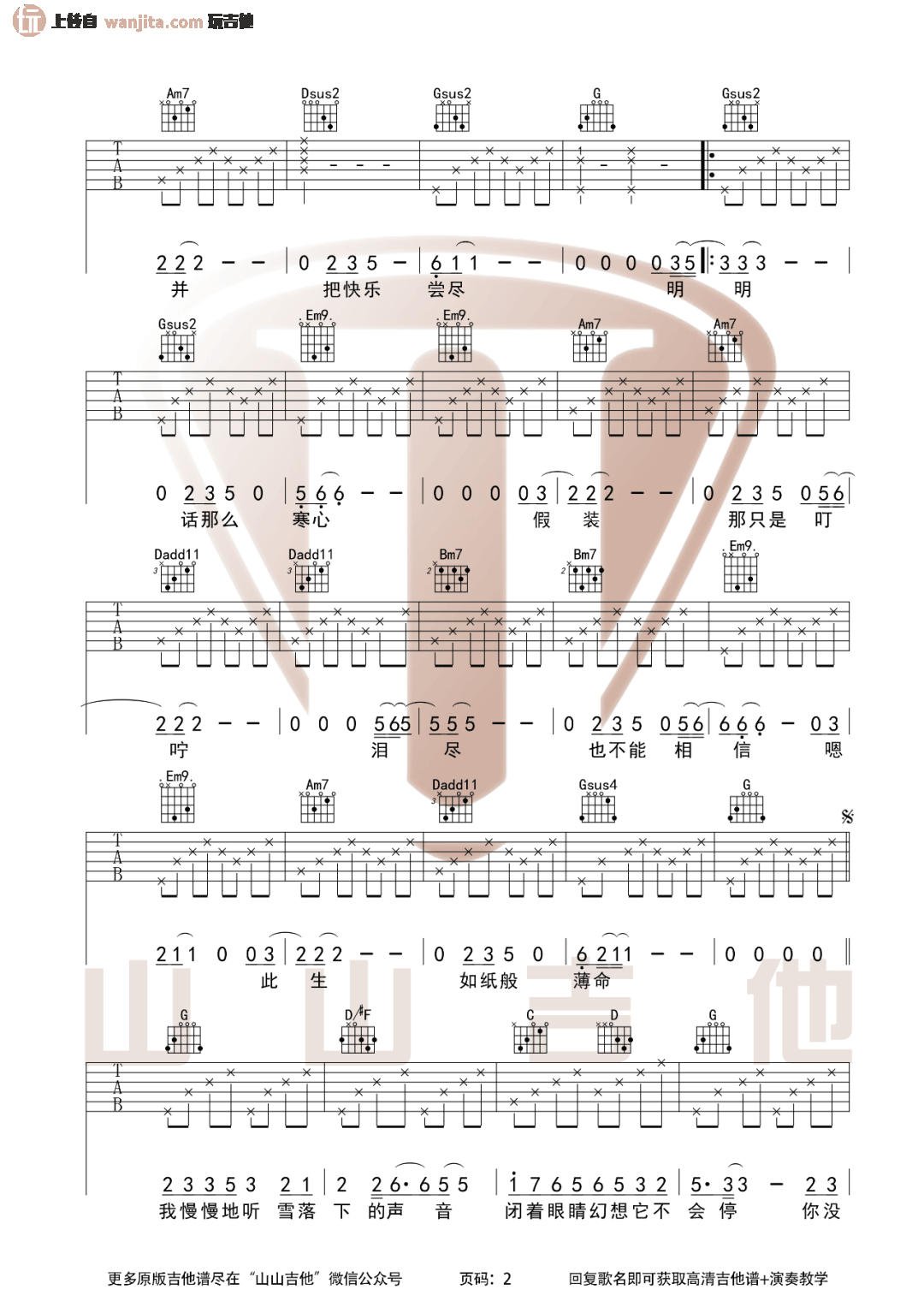 雪落下的声音吉他谱,它是演唱的歌曲,是一首经典歌曲编配的G调指弹六线简谱,歌曲的旋律抒情动人,让人心旷神怡。是非常好听又简单的吉他弹唱曲谱,下面2张高清完整版图片谱由曲谱网为大家更新分享,有喜欢吉它的朋友欢迎关注!