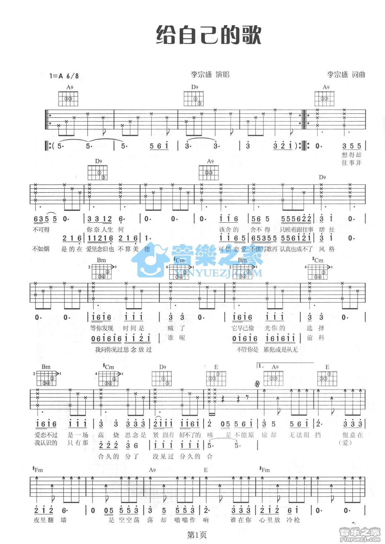 给自己的歌吉他谱,它是李宗盛演唱的歌曲,由音乐之家编配制谱,是一首经典歌曲编配的A调指弹编配的曲谱,