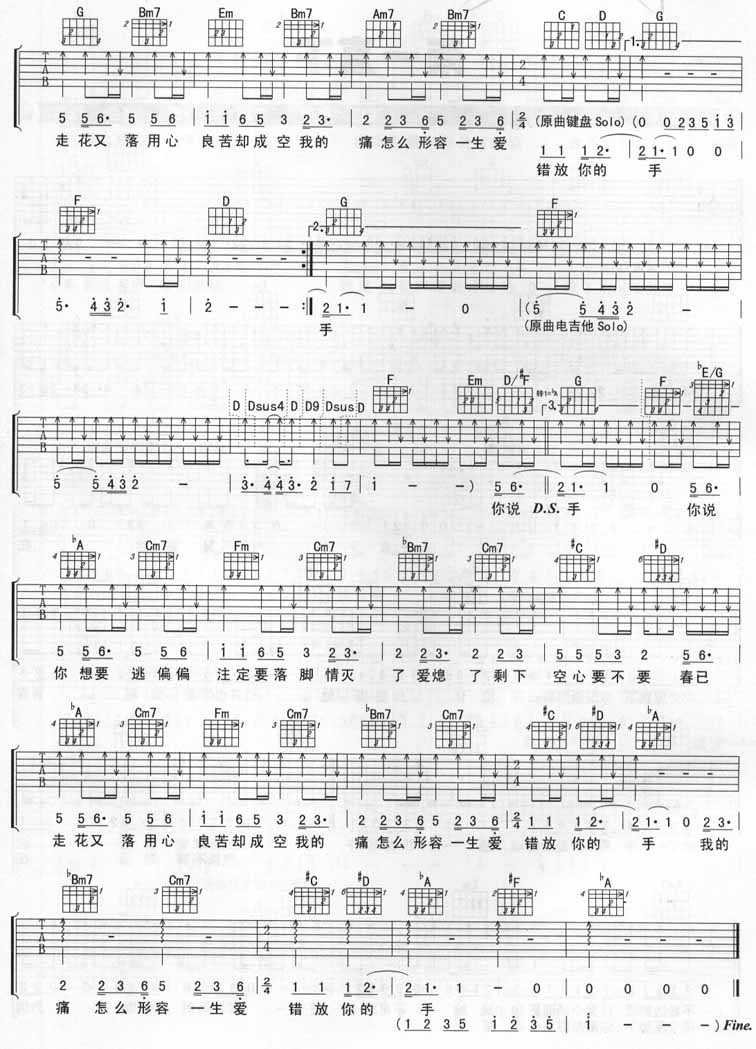用心良苦吉他谱,它是张宇演唱的歌曲,由网络转载编配制谱,是一首经典歌曲编配的G调指弹编配的曲谱,