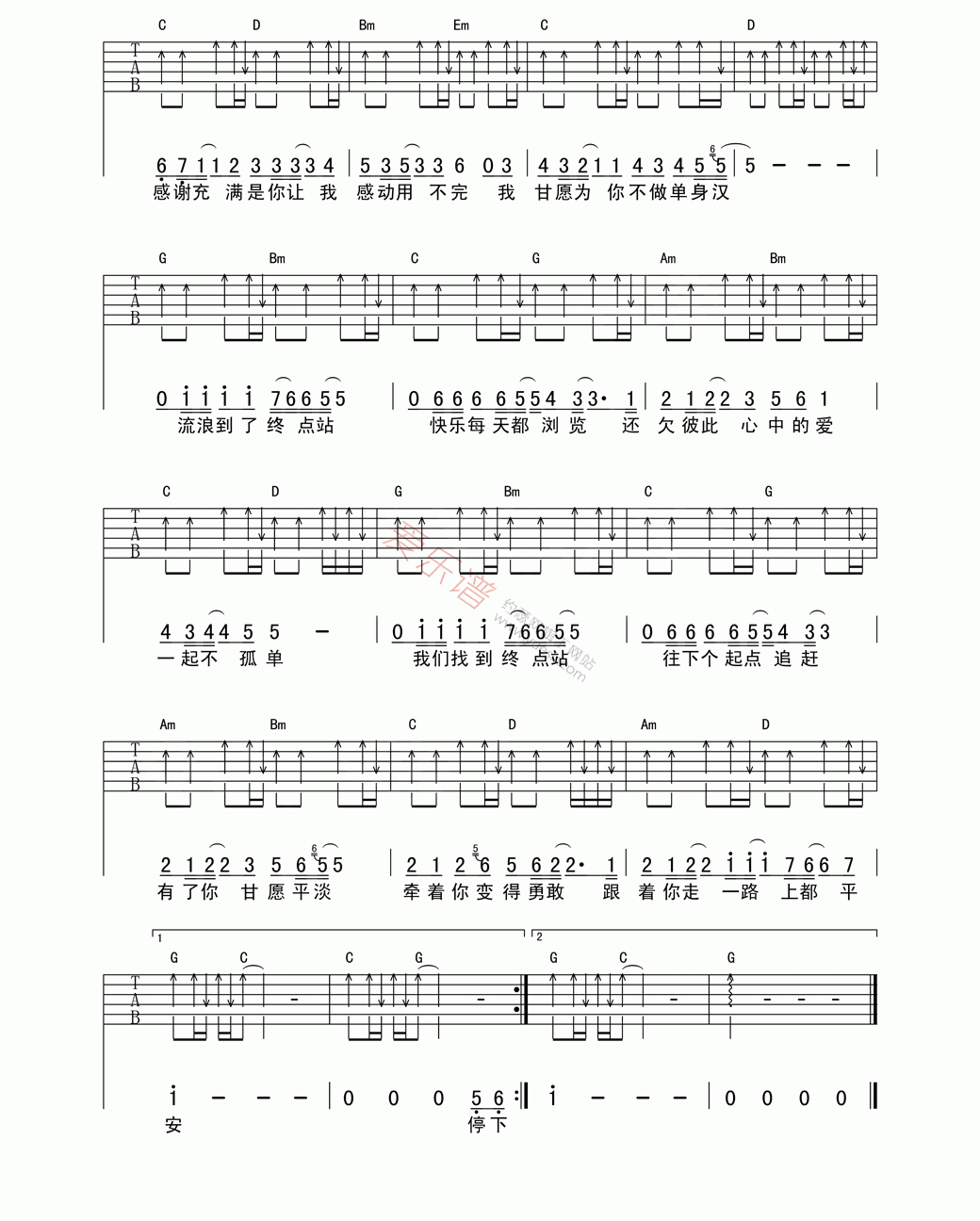 《终点站》吉他谱,由谢霆锋演唱的,流行弹唱,终点站六线谱,C调制法,一共2张高清弹唱图片谱,采用'4/4拍子,拍速为60-80,单吉他,弹奏难度为:极简,吉他部落 jita2012.com整理上传。终点站 吉他简谱终点站 歌词 作曲 : Vehnee Saturno 作词 : 何启弘停下脚步 放弃追逐请你被我照顾 画个温暖蓝图爱的温度 热情恢复手中的幸福 值得庆祝心事有你分摊 不再沉重中走的太蹒跚问号有