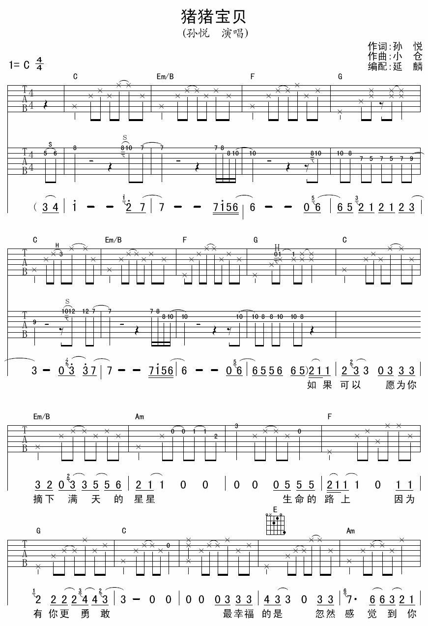 猪猪宝贝吉他谱,它是孙悦演唱的歌曲,由延麟编配制谱,是一首经典歌曲编配的C调指弹编配的曲谱,