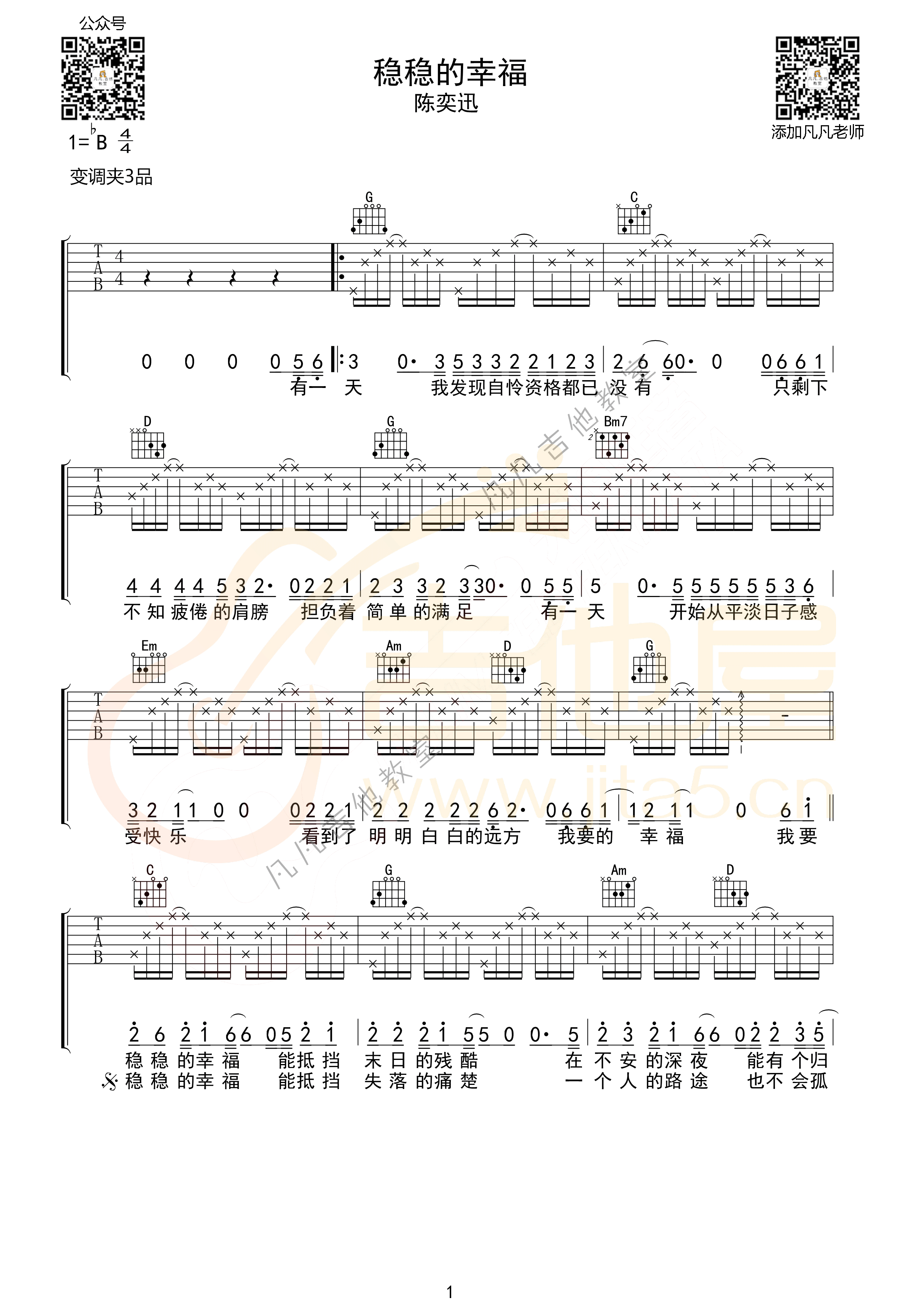 稳稳的幸福吉他谱,它是演唱的歌曲,是一首经典歌曲编配的G调指弹六线简谱,歌曲的和声清新动听,令人流连忘返。是非常好听又简单的吉他弹唱曲谱,下面2张高清完整版图片谱由曲谱网为大家更新分享,有喜欢吉它的朋友欢迎关注!