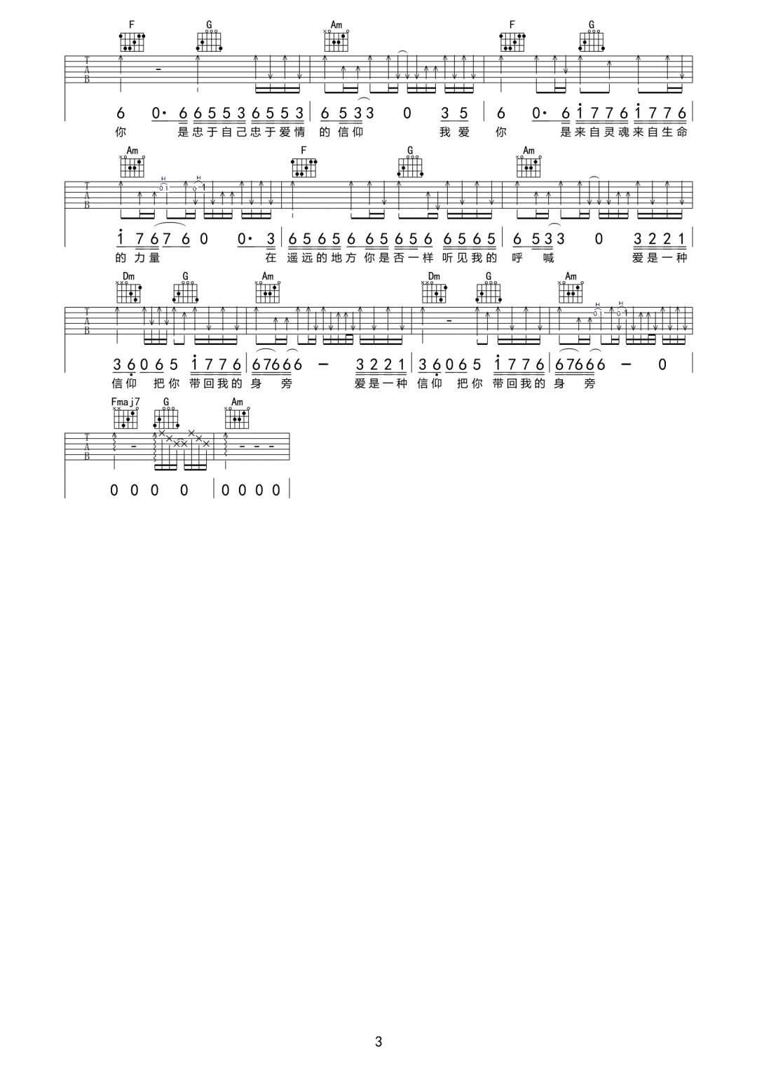 信仰吉他谱,原版歌曲,简单C调弹唱教学,六线谱指弹简谱3张图