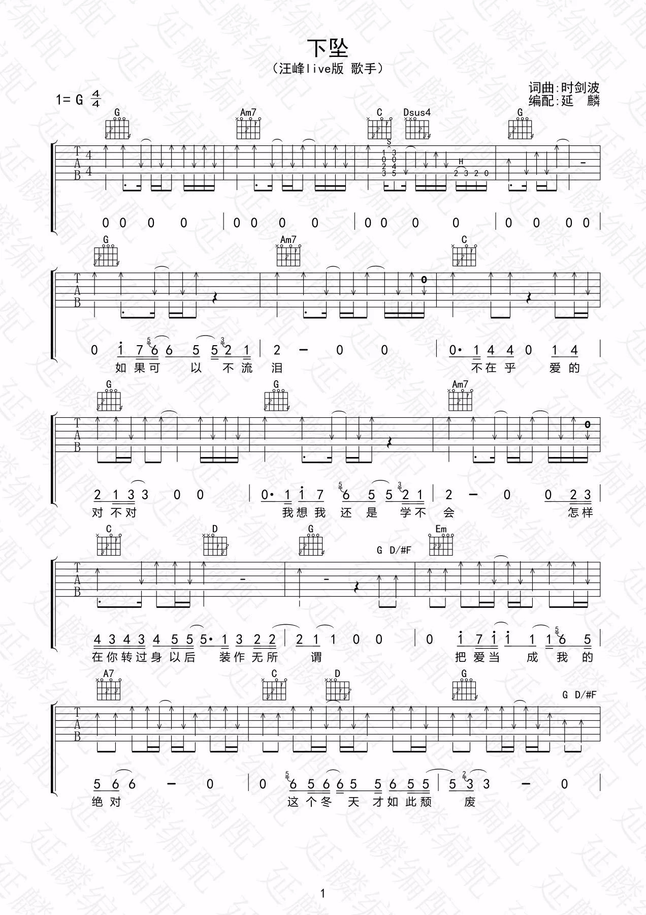 下坠吉他谱,它是汪峰演唱的歌曲,由延麟编配制谱,是一首经典歌曲编配的G调指弹编配的曲谱,