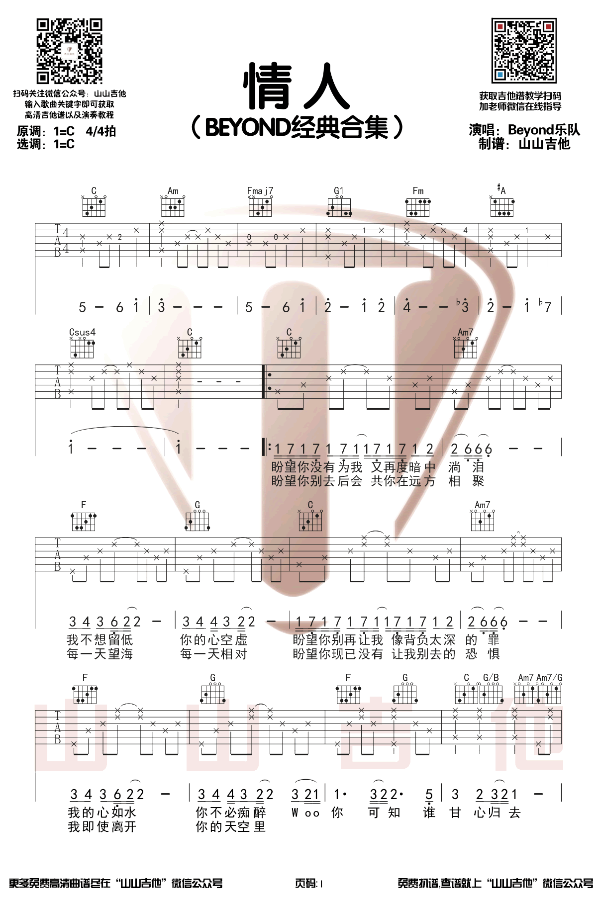 Beyond《情人》,它是刘卓辉黄家演唱的歌曲,由山山吉他制谱,是一首经典歌曲编配的吉他谱,,本谱采用Bey非常好听的弹唱曲谱,下面完整版高清曲谱由吉他谱大全为大家更新分享,有喜欢吉它的朋友欢迎关注!