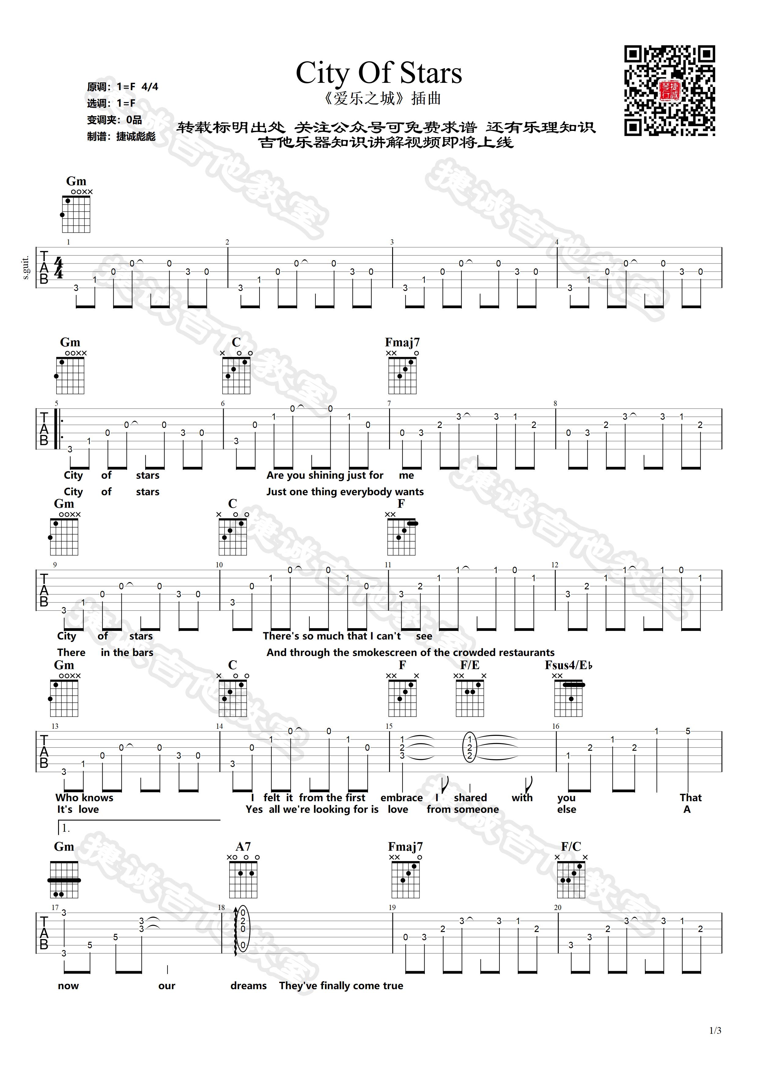 City Of Stars吉他谱,取自演唱的歌曲是经典F调指弹编配的曲谱,非常好听的弹唱曲谱,下面3张高清曲谱由吉曲谱网为大家更新分享,有喜欢吉它的朋友欢迎关注!