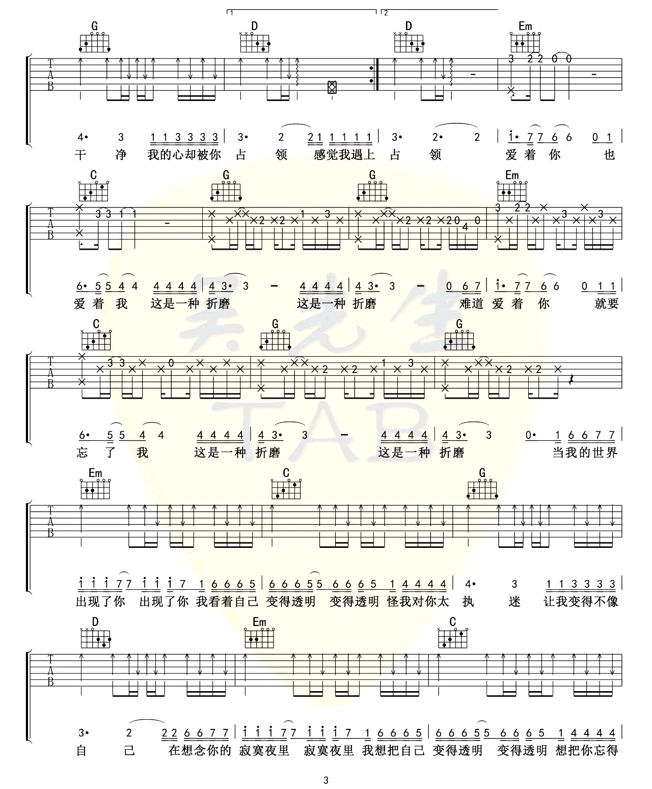 透明吉他谱,它是演唱的歌曲,是一首经典歌曲编配的G调指弹六线简谱,这首歌是我最喜欢的歌曲之一。是非常好听又简单的吉他弹唱曲谱,下面4张高清完整版图片谱由曲谱网为大家更新分享,有喜欢吉它的朋友欢迎关注!