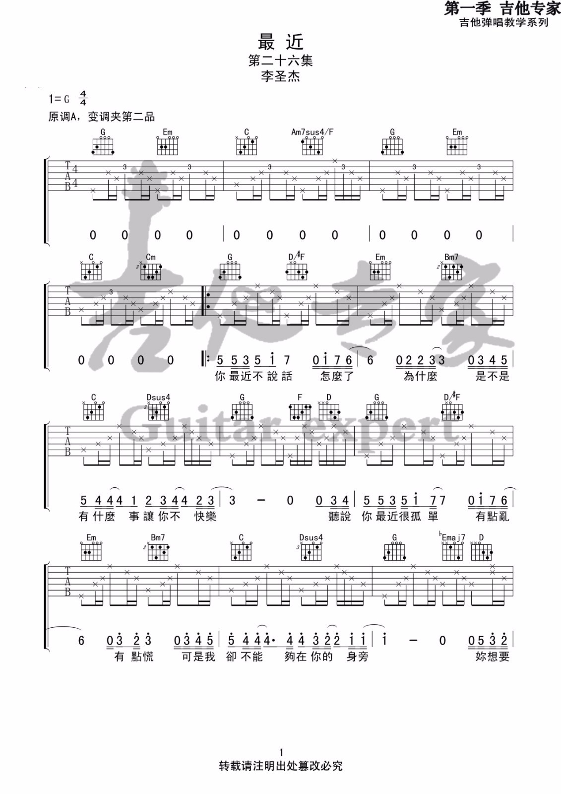 分享最近吉他谱,最近由李圣杰演唱,发行时间是2009-02-13,收录于专辑关于你的歌, ;
