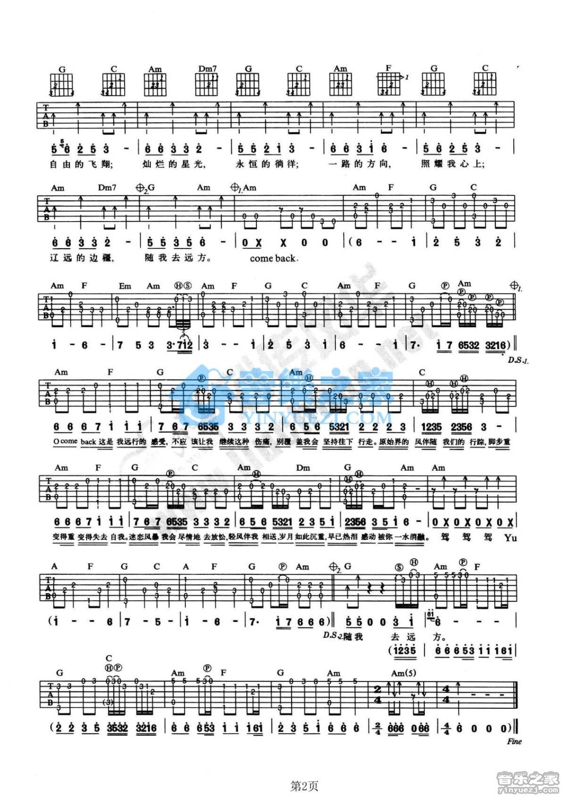 自由飞翔吉他谱,它是凤凰传奇演唱的歌曲,由音乐之家编配制谱,是一首经典歌曲编配的C调指弹编配的曲谱,
